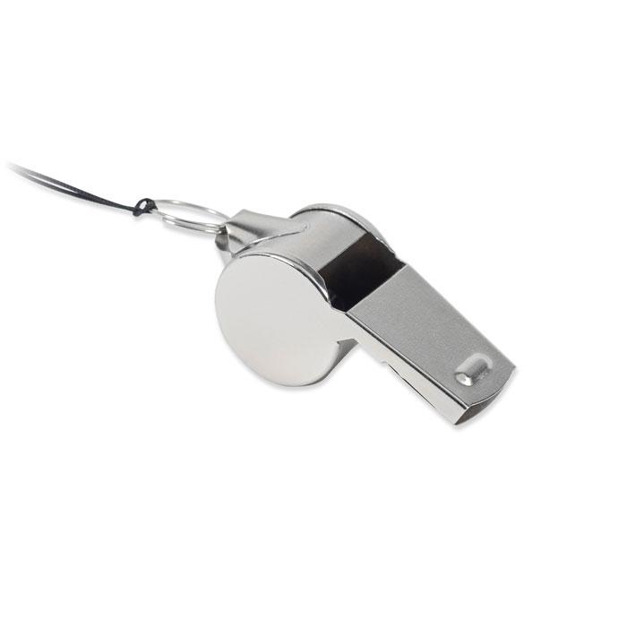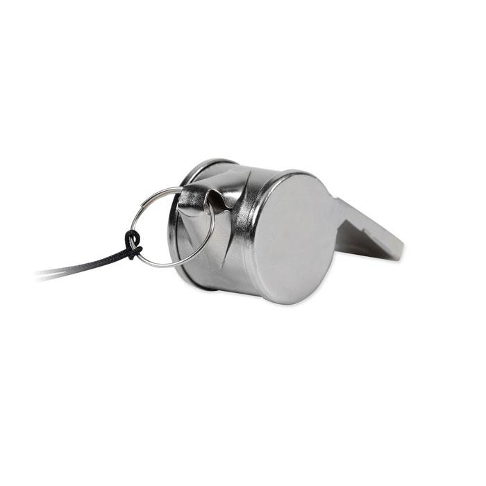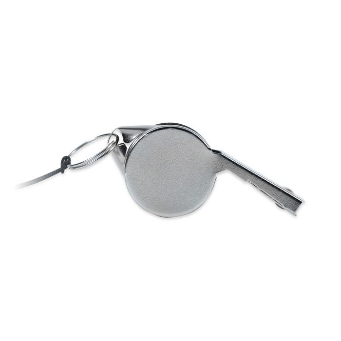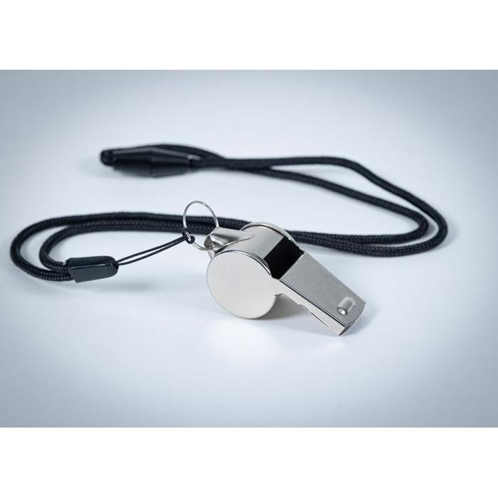 Kovová píšťalka na šňůrce s bezpečnostní sponou.