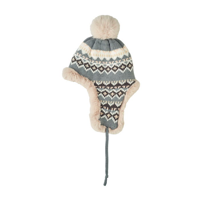 Pletená čepice s klapkami na uši a bambulí z akrylového vlákna s polyesterovou a fleecovou podšívkou. Štítek pro potisk na jedné straně. Velikost pro dospělé.