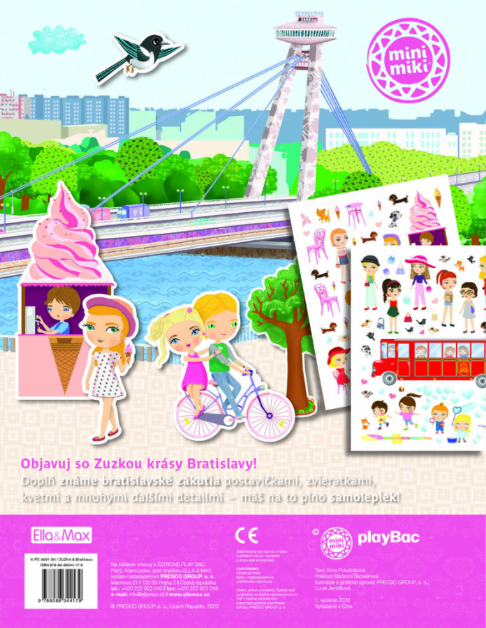 Obľúbená séria minimiky prichádza s ďalšou novinkou v podobe zábavnej samolepkovej knižky, v ktorej budú deti spoločne s bábikou Zuzkou a jej kamarátkami Luciou a Katarínou objavovať najznámejšie zákutia slovenskej metropoly Bratislavy. Známe bratislavské scenérie môžu deti dopĺňať množstvom krásnych samolepiek podľa vlastnej fantázie a v knihe nájdu aj veľa zaujímavých informácií o tunajších pamiatkach, známych miestach, ale aj napríklad o vychýrených špecialitách slovenskej kuchyne